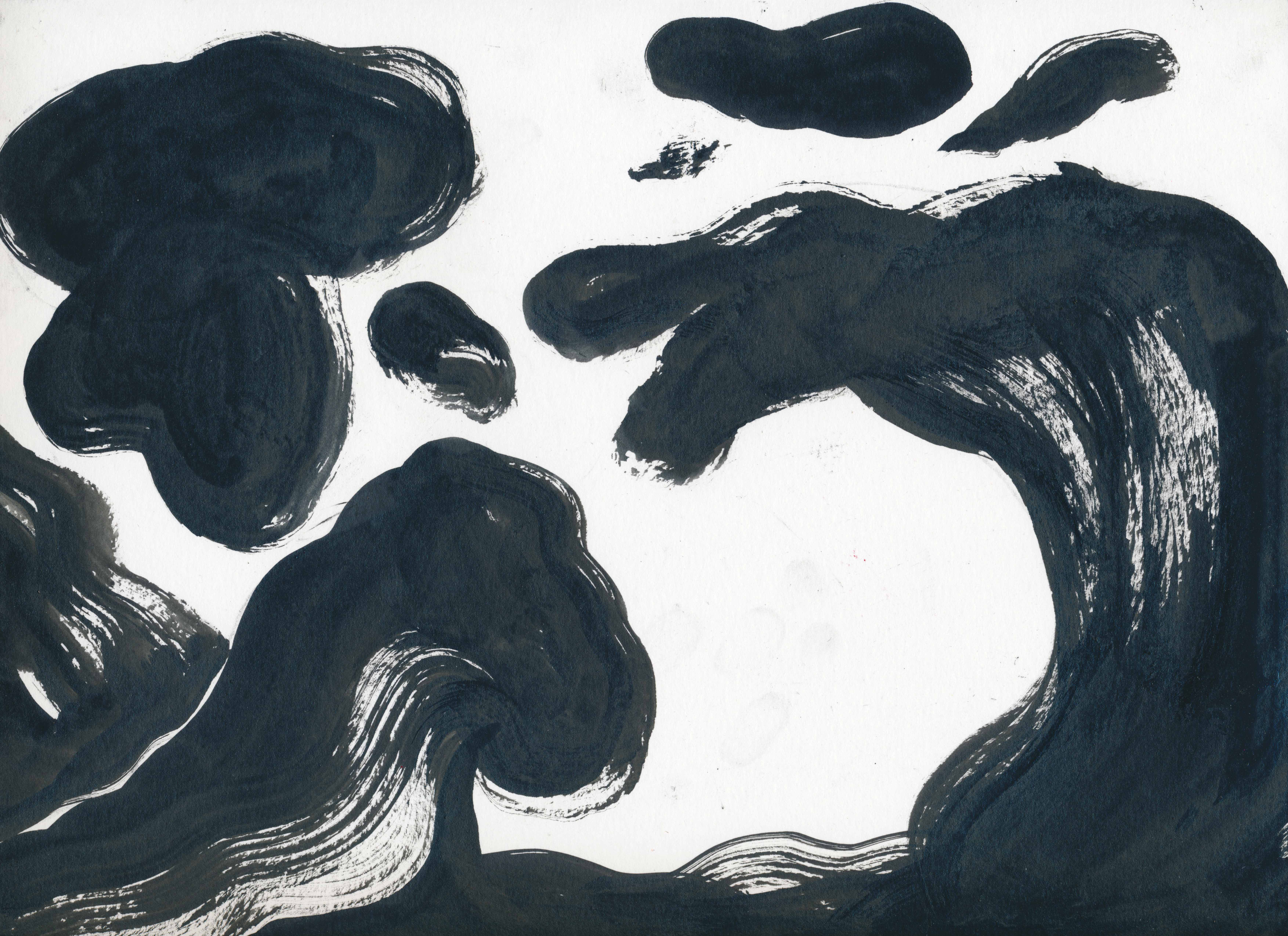 “The final illustrations are an assemblage of both hand drawn / painted elements and digitally illustrated elements . . . . To illustrate the wave, I wanted to capture the movement and energy of a tsunami. To achieve this, I utilized heavy ink and brushstrokes to emulate the dynamic nature of the waves.”